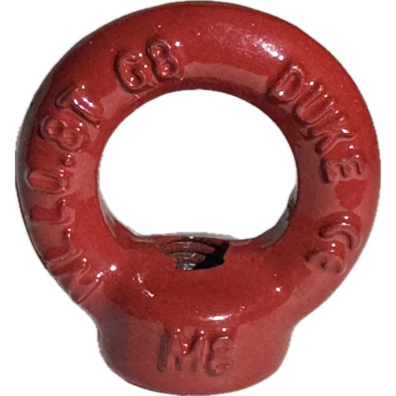 Lyftöglemutter med invändig gänga tillverkad i höghållfast material, hållfasthetsklass 8. Ytbehandlad i röd färg för enkel identifiering. (Max last 0,8t